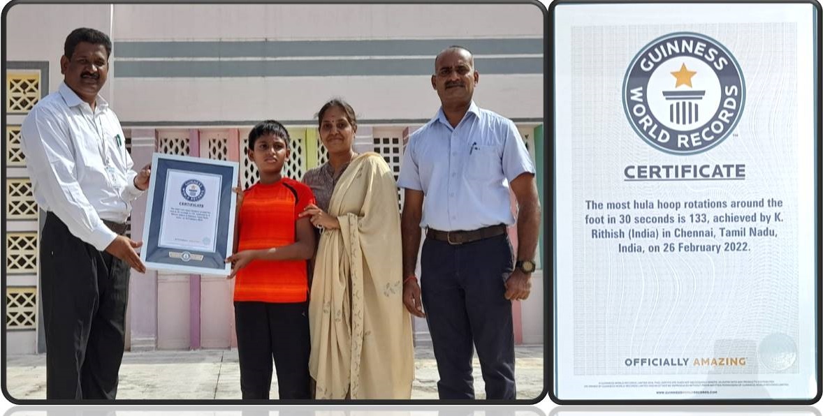 RITHISH K - GRADE VI , has achieved GUINNESS WORLD RECORD for the most Hula-hoop rotations around the foot in 30 seconds