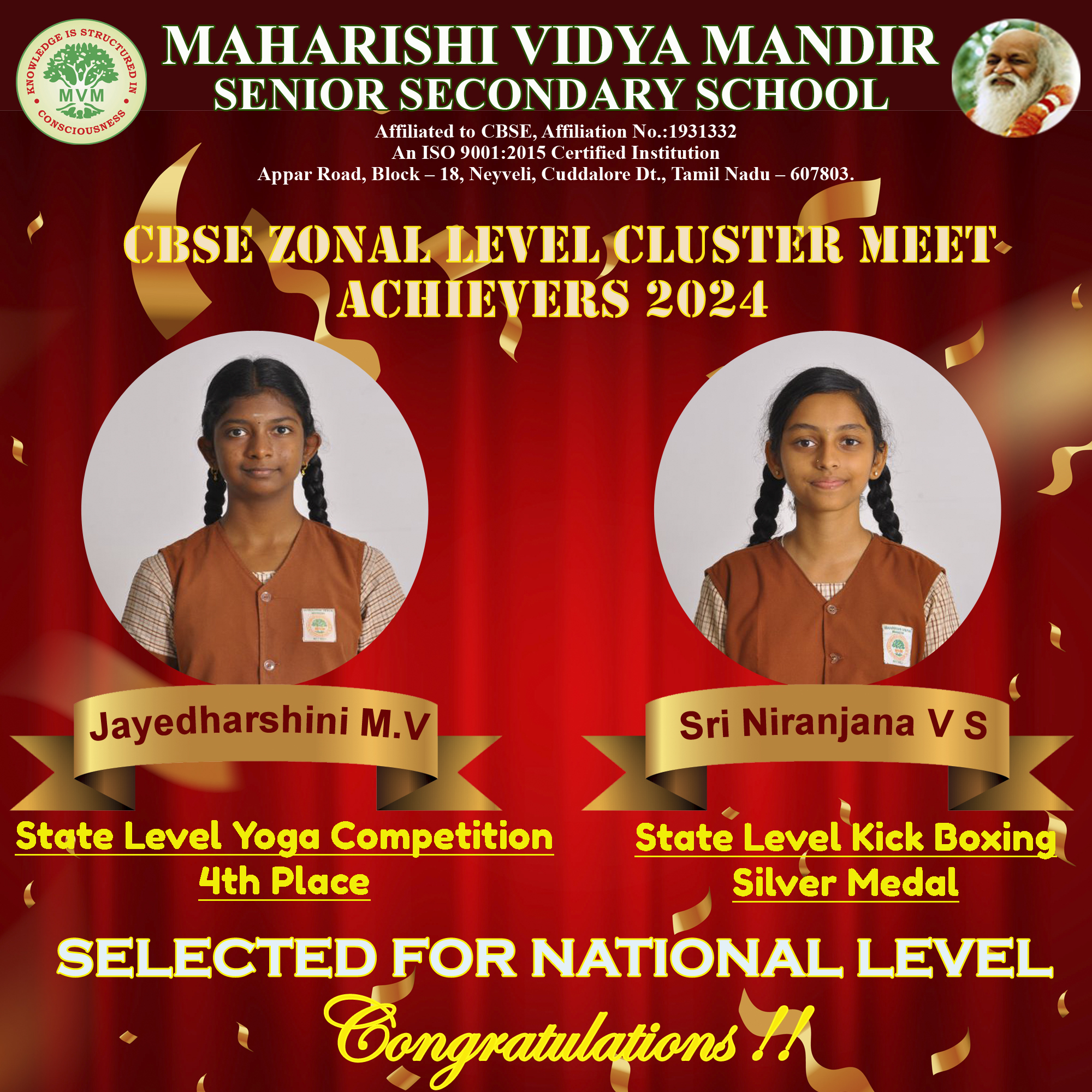 Our student, Miss. Sri Niranjana V S, participated in the CBSE National Boxing Tournament held in Haryana and Miss. Jayedharshini M V participated in the CBSE South Zone Yoga Competition and won a bronze medal. - 18 December 2024
